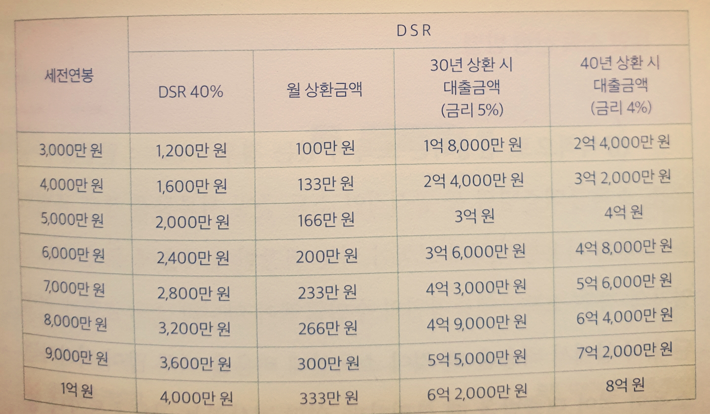 현재 주택담보대출비율의 DSR은 40%다. 1억원을 버는 사람은 총부채의 대출원금과 이자 상환으로 4천만원 이상 사용하지 말라는 뜻이다.