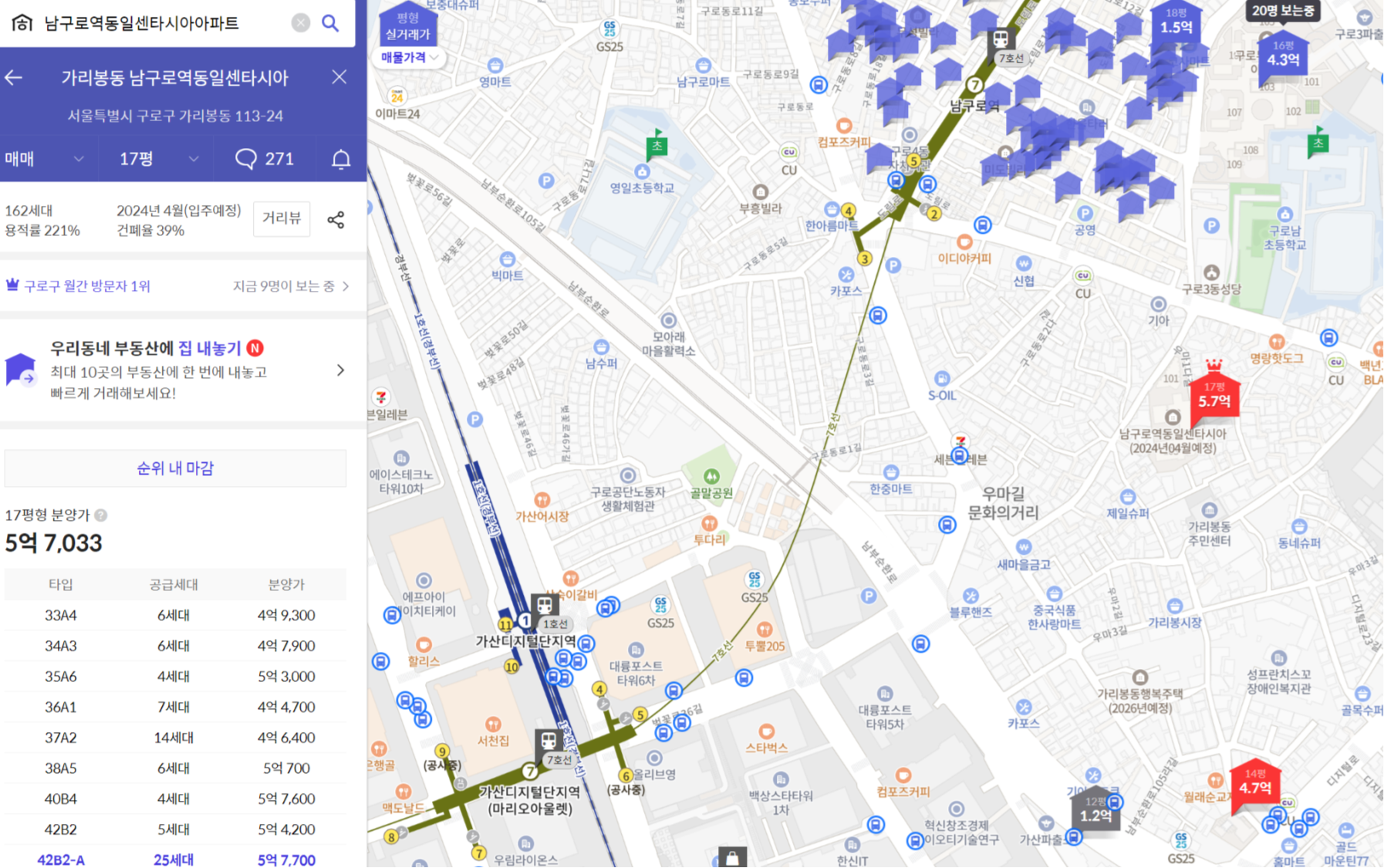 1호선 금천구청역 역세권에 위치한 이 단지는 2010년대 중반 분양 당시만 해도 가격이 비싸다는 의견이 많았지만 준공 후 서울 시내에서 가격 상승률이 가장 높은 단지 중 하나로 평가받는다.