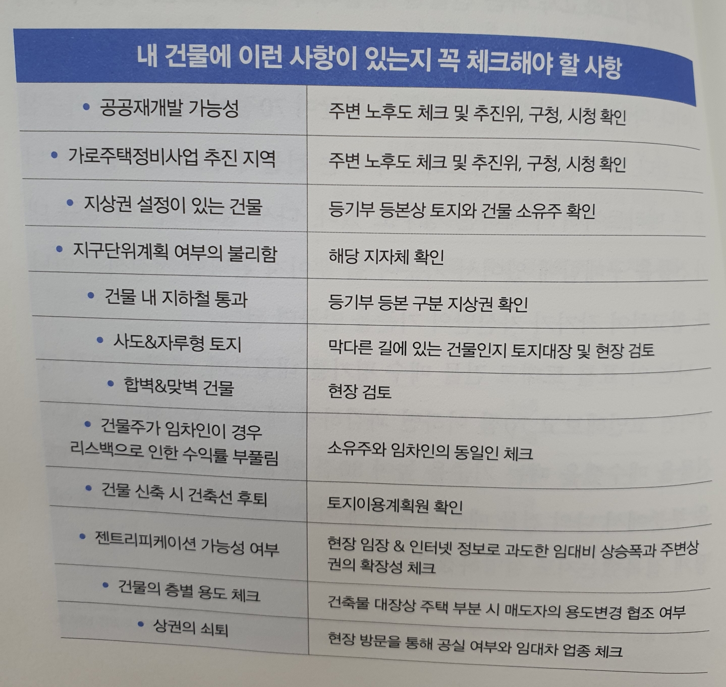 표. 내 건물에 이런 사항이 있는지 꼭 체크해야할 사항