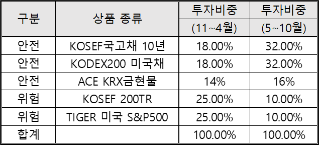 장기 투자 관점에서 계절별로 나누어 투자하는 것도 좋은 전략인 것 같아 자산 배분을 해보았다.