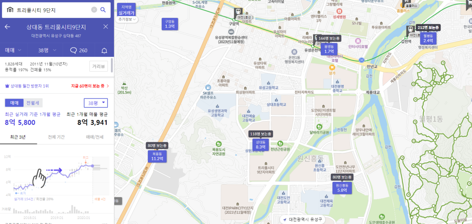 월평동 만연동 3억 정도 형성 되어 있다.