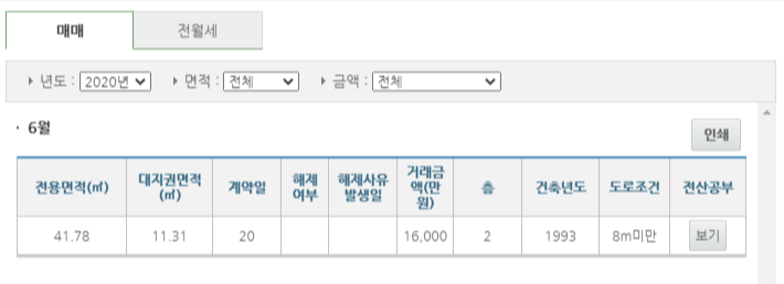 주택 전용 면적 기준 동일 면적 기준 1.6억원 정도로 판매 되었다. (건축년도 1993년)
