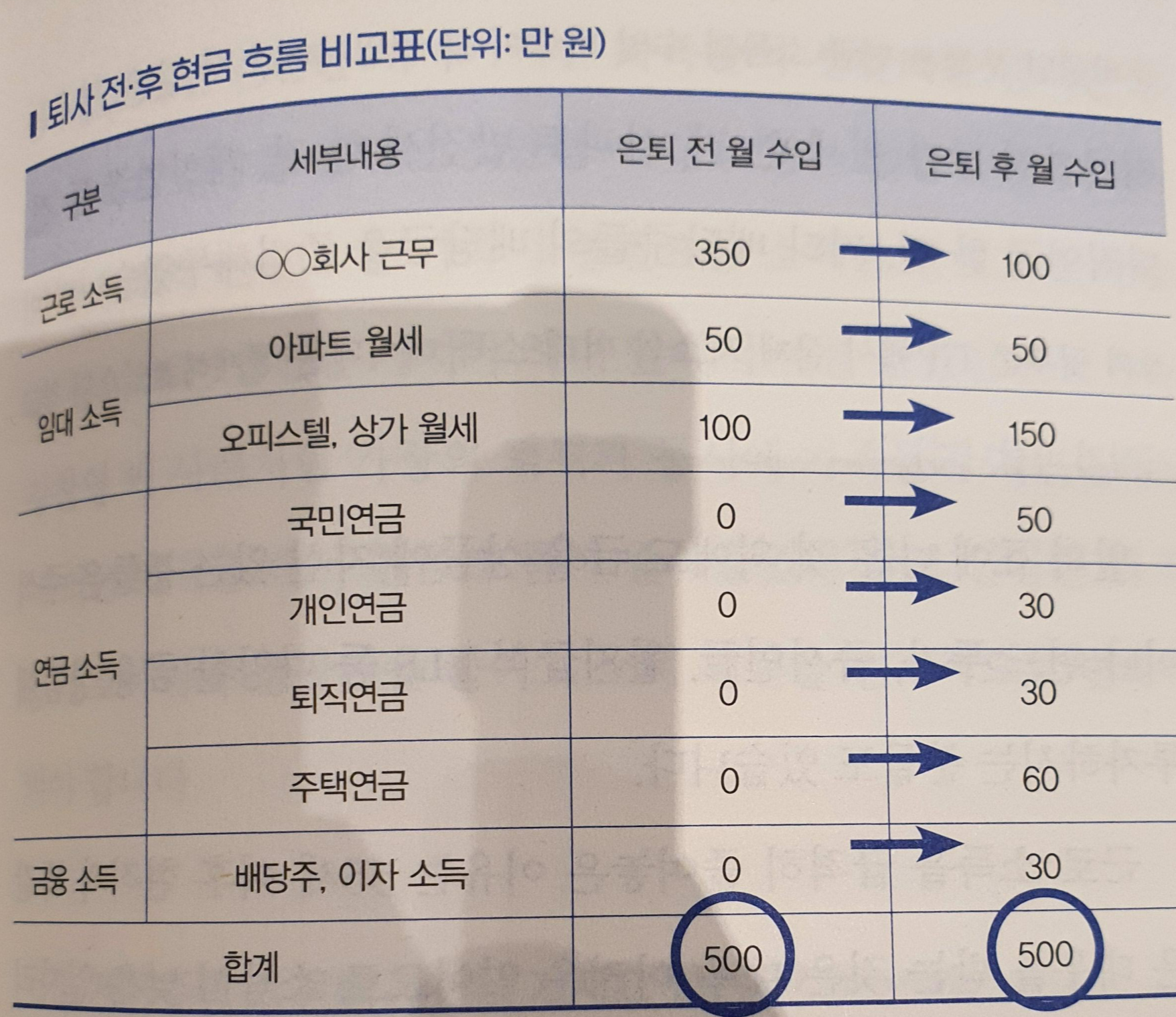 만약 월급과 임대 소득에서 500만원을 벌고 있던 직장인이 은퇴 후에는 어떻게 비슷한 금액을 벌어들일수 있을지 현금 흐름을 준비하고 미래를 설계해보는 것이다.