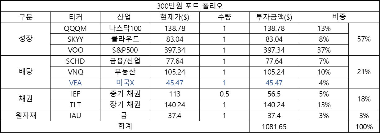 성장, 배당, 채권, 원자재를 기준으로 분양별 비중을 얼마로 채울ㅈ 본인의 투자 성향과 투자 기간에 맞게 구성하면 된다.