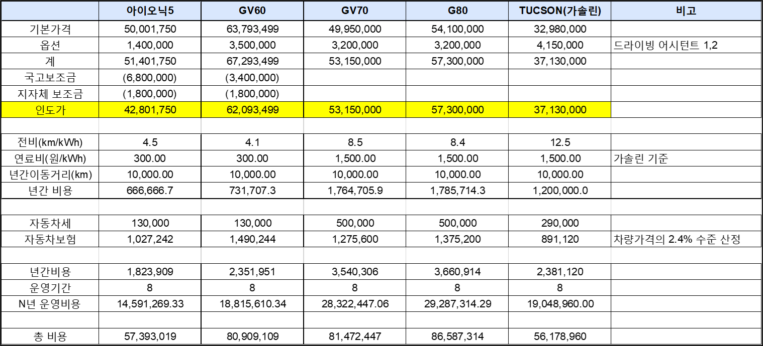 제네시스 기준으로도 GV60을 탔을 때 초기 가격은 비싸지지만 GV70 GV80에 비하면 전체 운영비 측면에서 보면